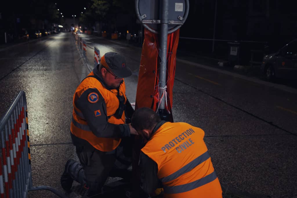 (Illustrations : Protection civile JNV en action lors du montage et de la sécurisation du parcours)